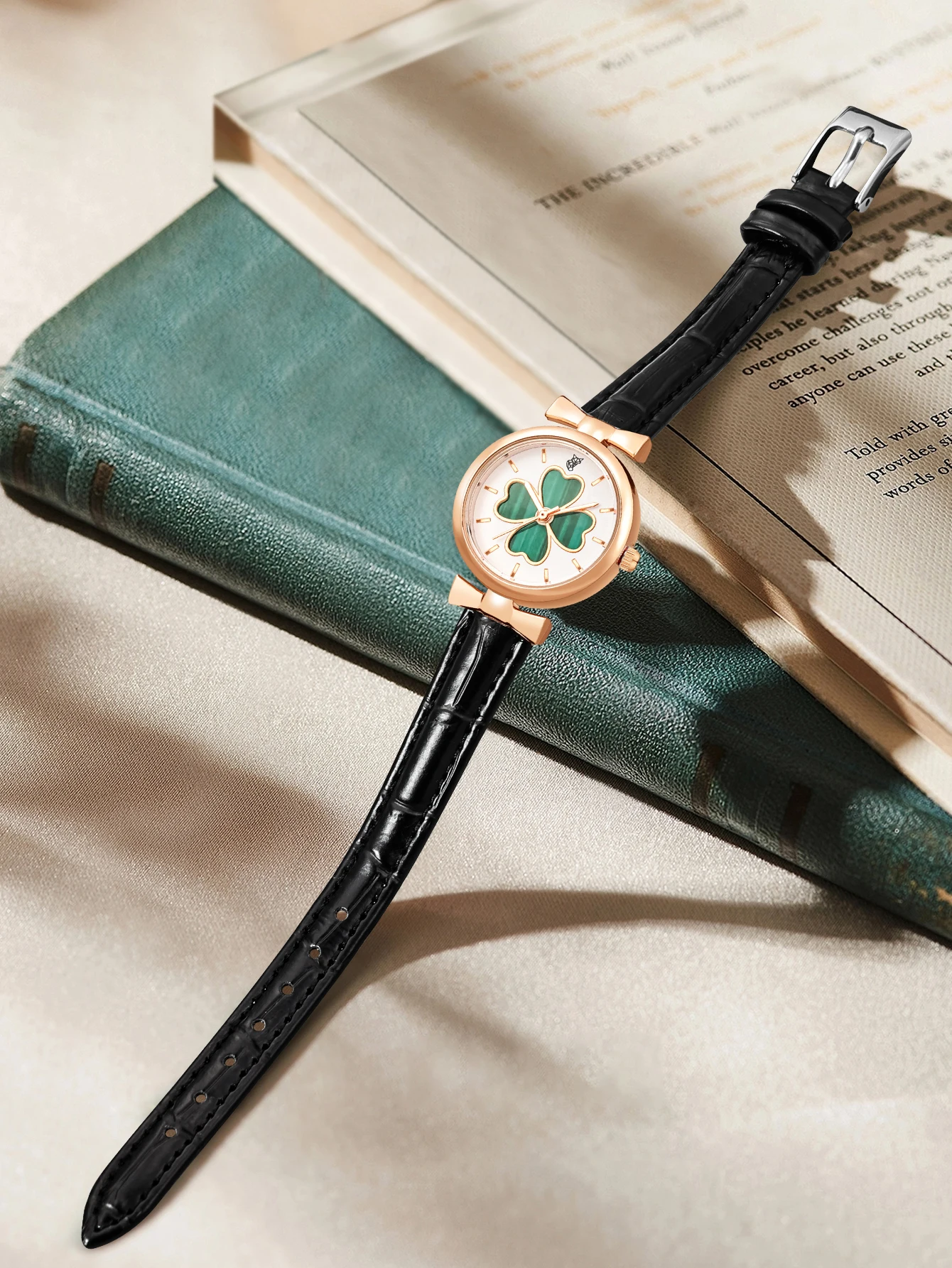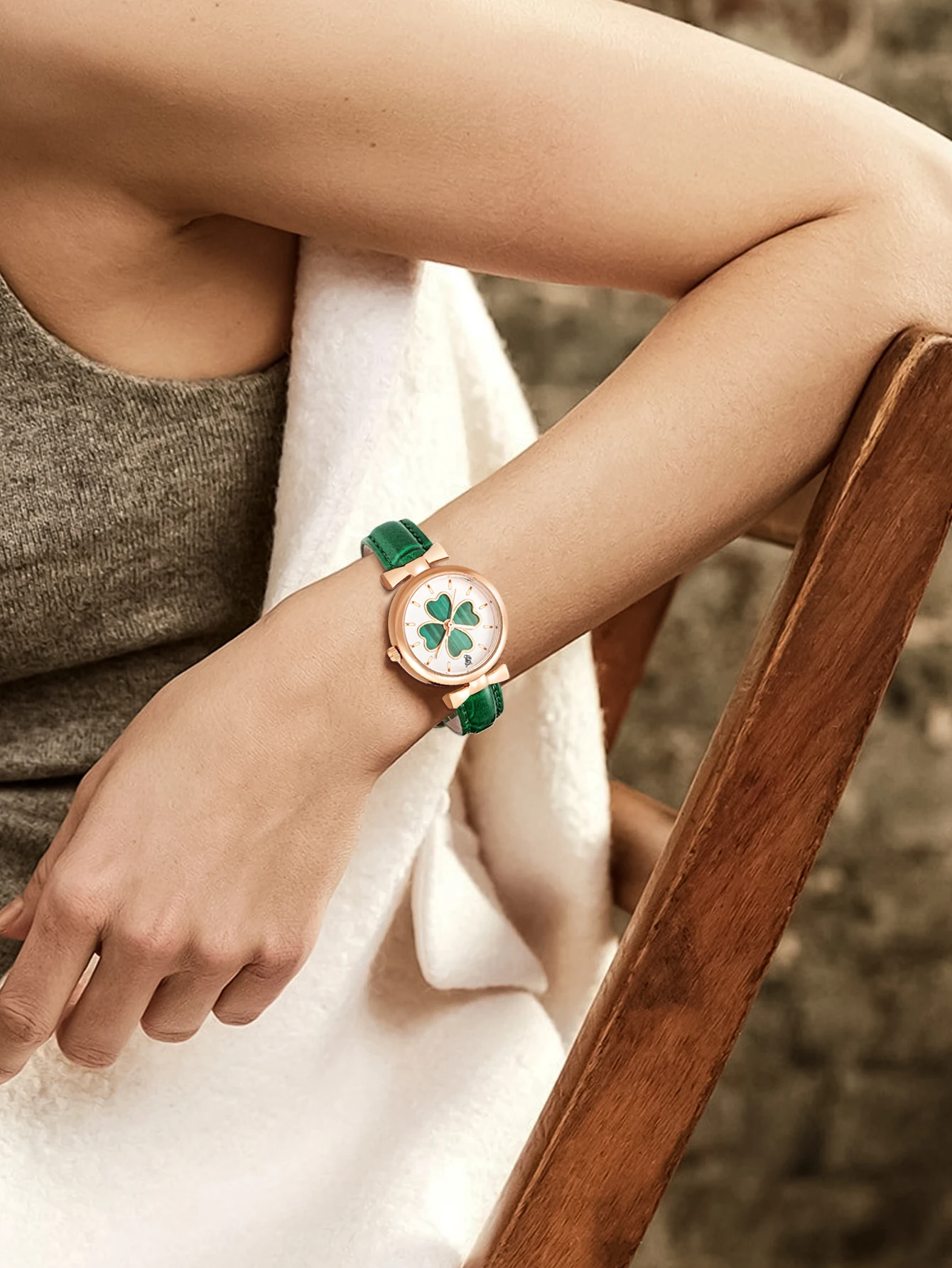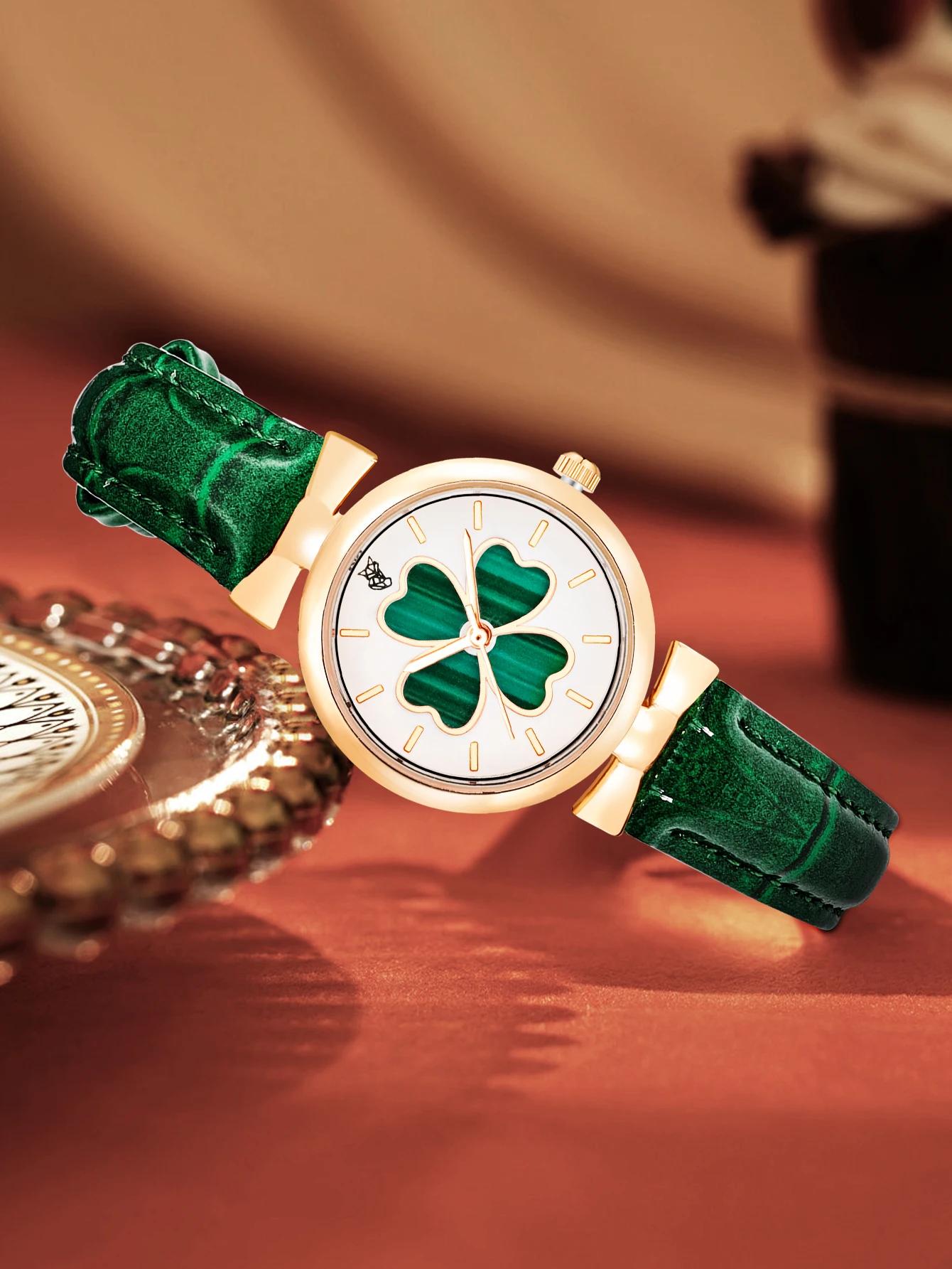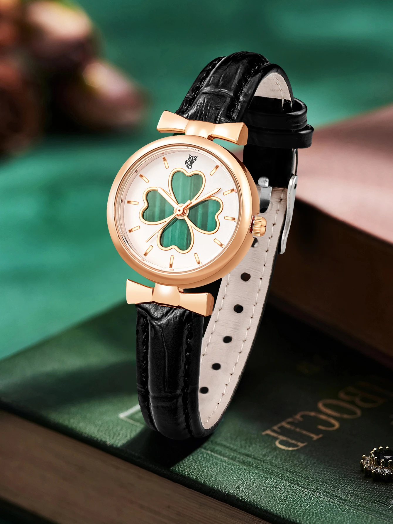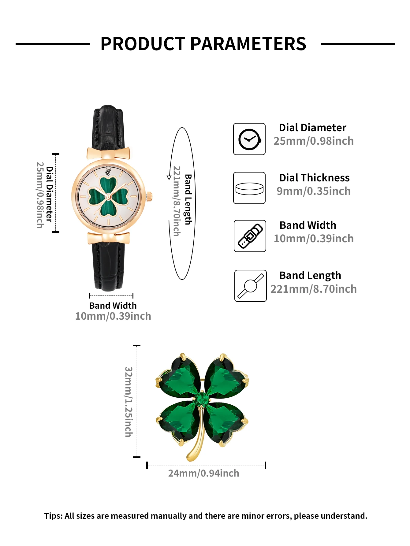 - مكونات الطقم: ساعة كوارتز نسائية، بروش برسيم بأربع أوراق