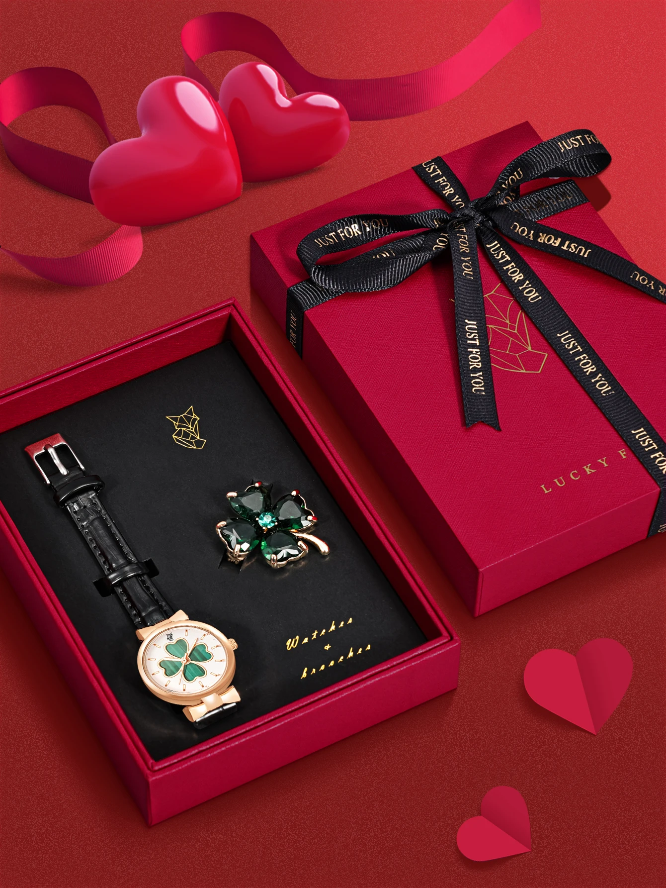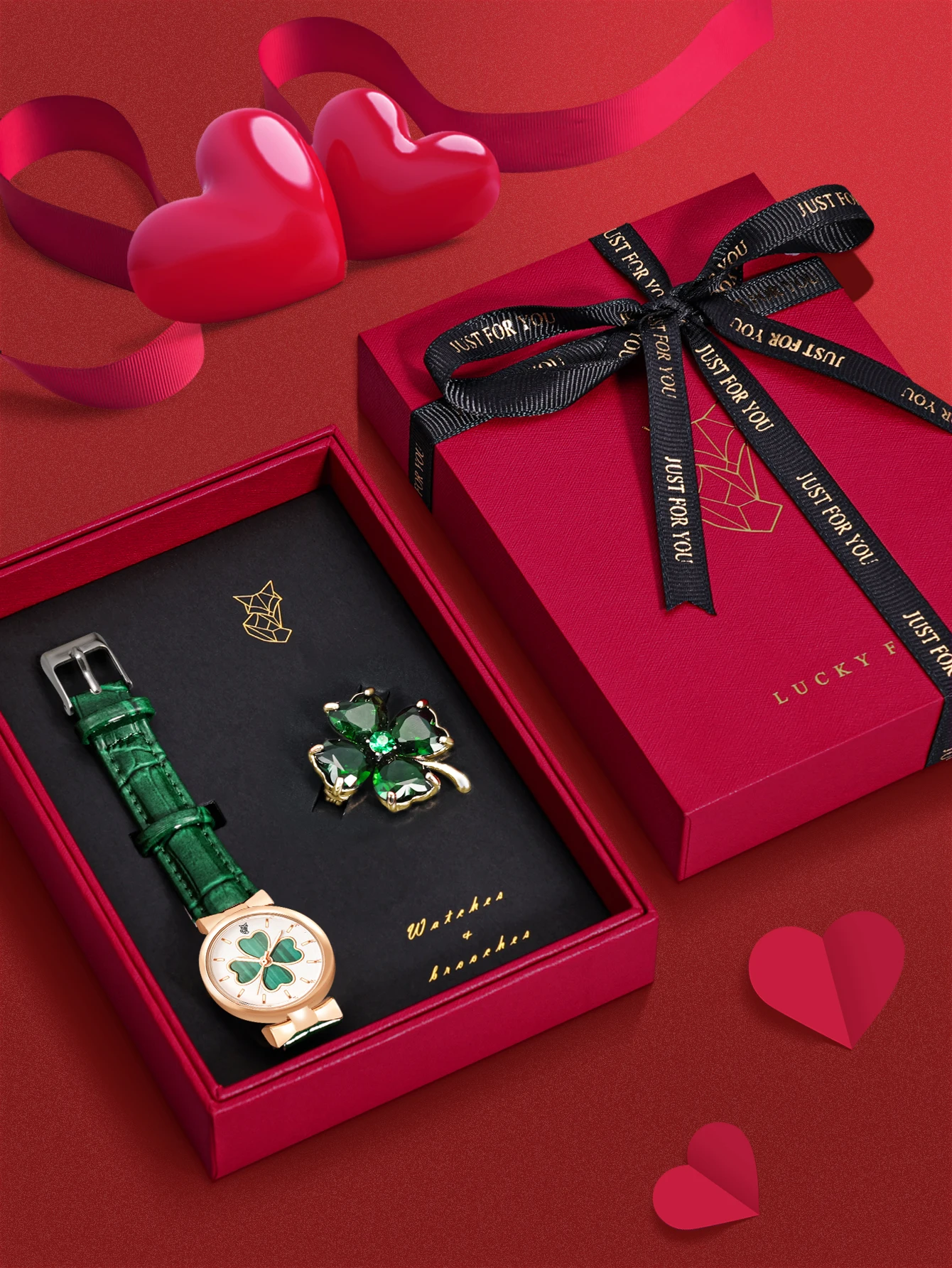 مجموعة الثعلب المحظوظ تتضمن ساعة كوارتز نسائية أنيقة وبروش برسيم بأربع أوراق، تصميم بسيط لكنه فاخر، مثالي لهدية مميزة تعبّر عن الحظ والسعادة، مع تغليف راقٍ وبطاقة تهنئة تعزز قيمتها.
