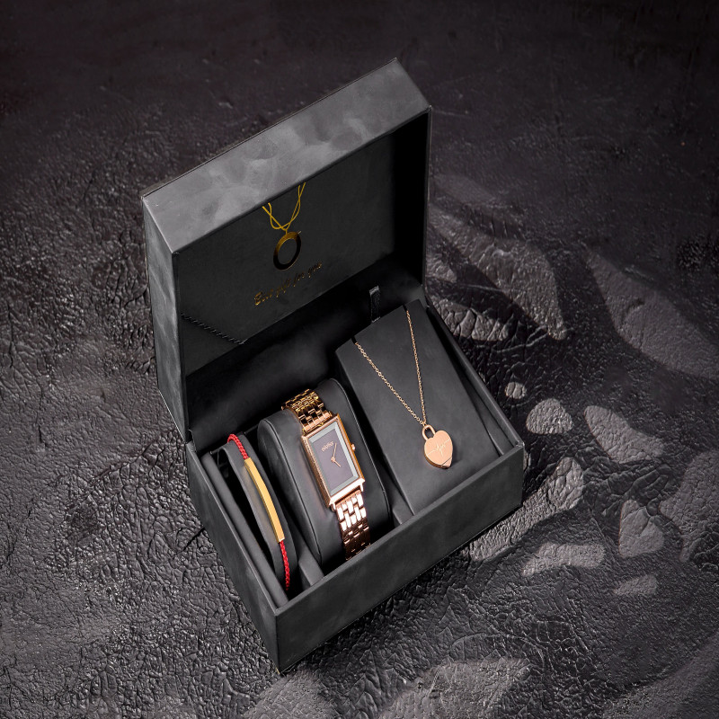 قدّم هذا الطقم الرائع لمن تحب ليظل ذكرى جميلة تدوم. الطقم يشمل ساعة بلون الذهب الوردي، سلسلة بقلب مميز، وسوار أنيق مع إمكانية تخصيص الاسم لجعل الهدية فريدة وشخصية.