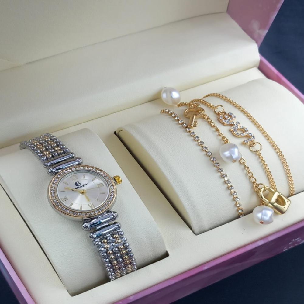 طقم طقم ساعه مع اساور نسائي أنيق يجمع بين التصميم الفخم والجودة العالية. مثالي للإهداء مع ضمان سنة على الساعة، يضيف لمسة جذابة لإطلالتك اليومية والمناسبات الخاصة.
