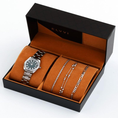 - تصميم الساعة والأساور يجمع بين البساطة والأناقة في إطلالة متكاملة ومميزة.