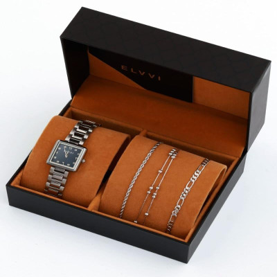 - اسم المنتج: هدايا نسائية بلون فضي من ساعة وأساور