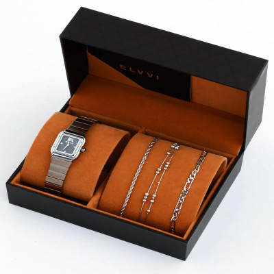 هدية نسائية مميزة بلون فضي تجمع بين ساعة أنيقة وأساور بتصميم راقٍ، مثالية للمناسبات الخاصة، تضيف لمسة فخمة وعصرية لإطلالتك، مع ضمان شامل لمدة سنة يضمن جودة المنتج وثقتك الكاملة.